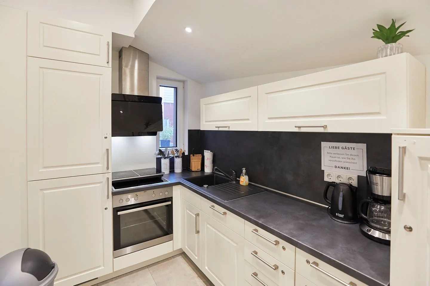 Im Erdgeschoss des Hauses steht den Gästen eine umfangreich ausgestattete Gemeinschaftsküche sowie eine Außenterrasse zur Verfügung. Hier können sich die Gäste Ihre Mahlzeiten zubereiten - dafür steht jedem Appartement ein eigener abschließbarer Kühlschrank zur exklusiven Nutzung zur Verfügung.
