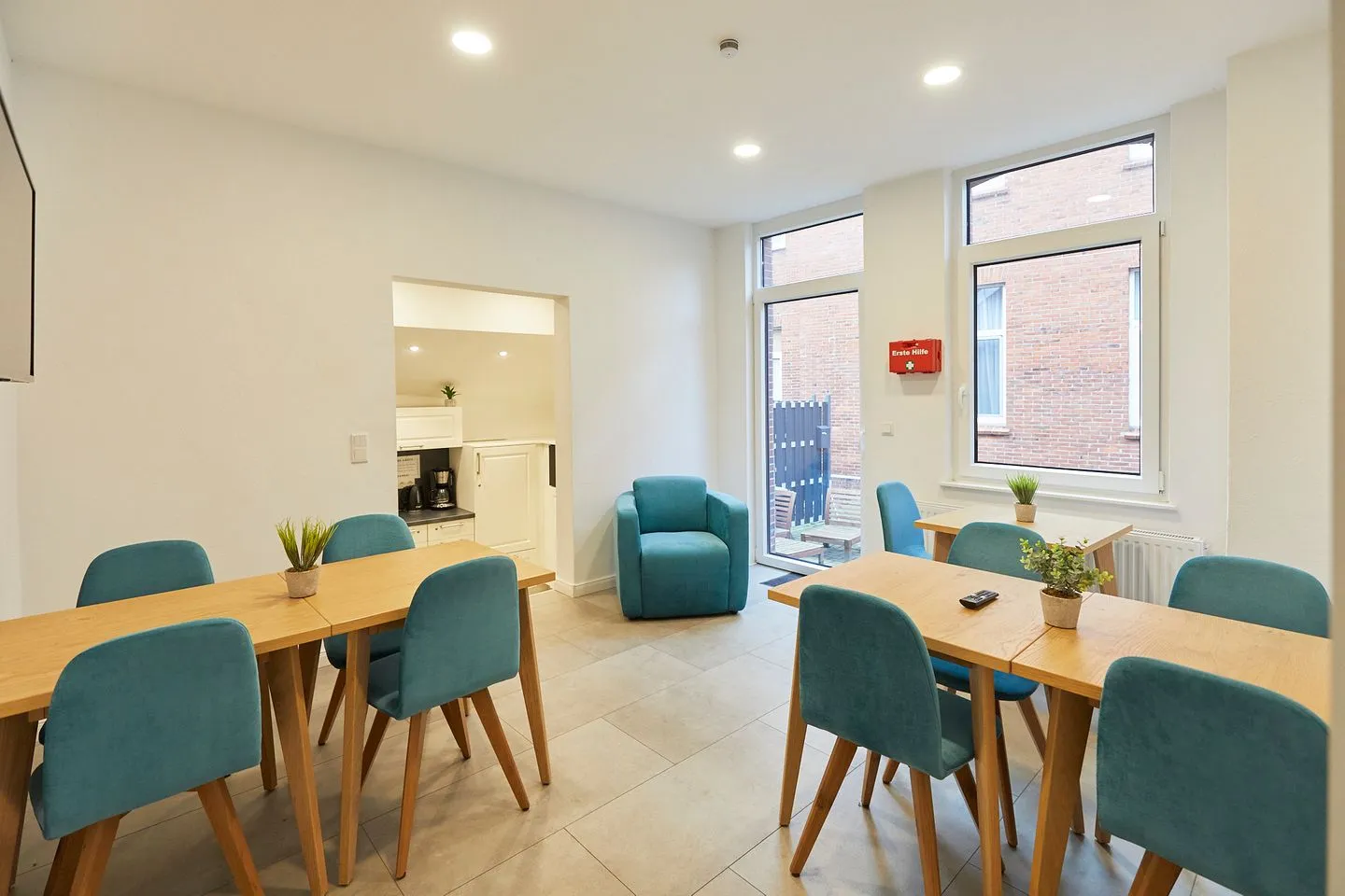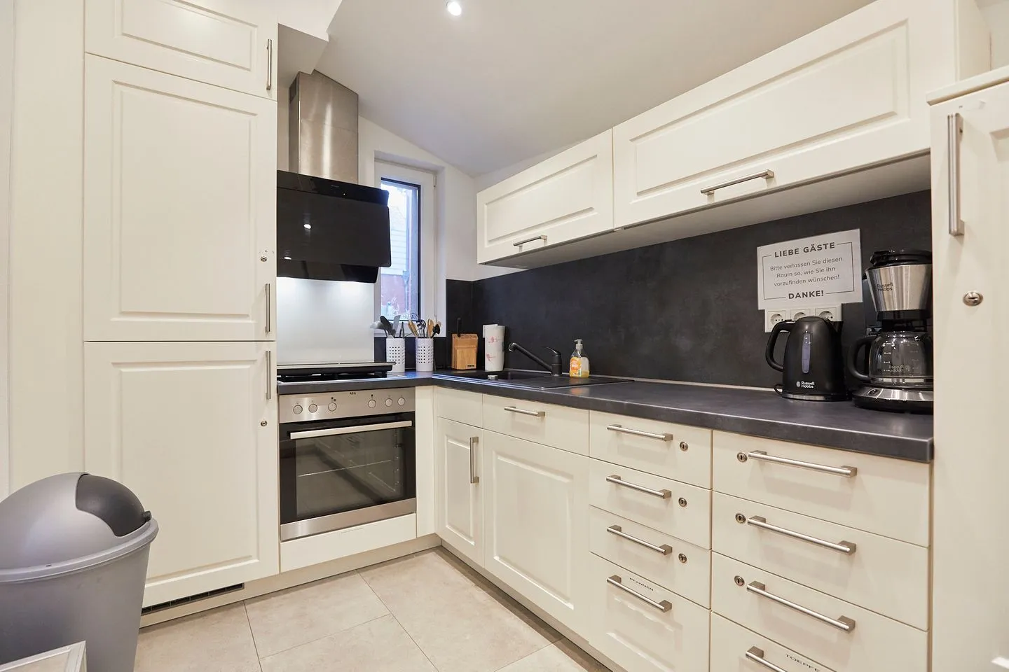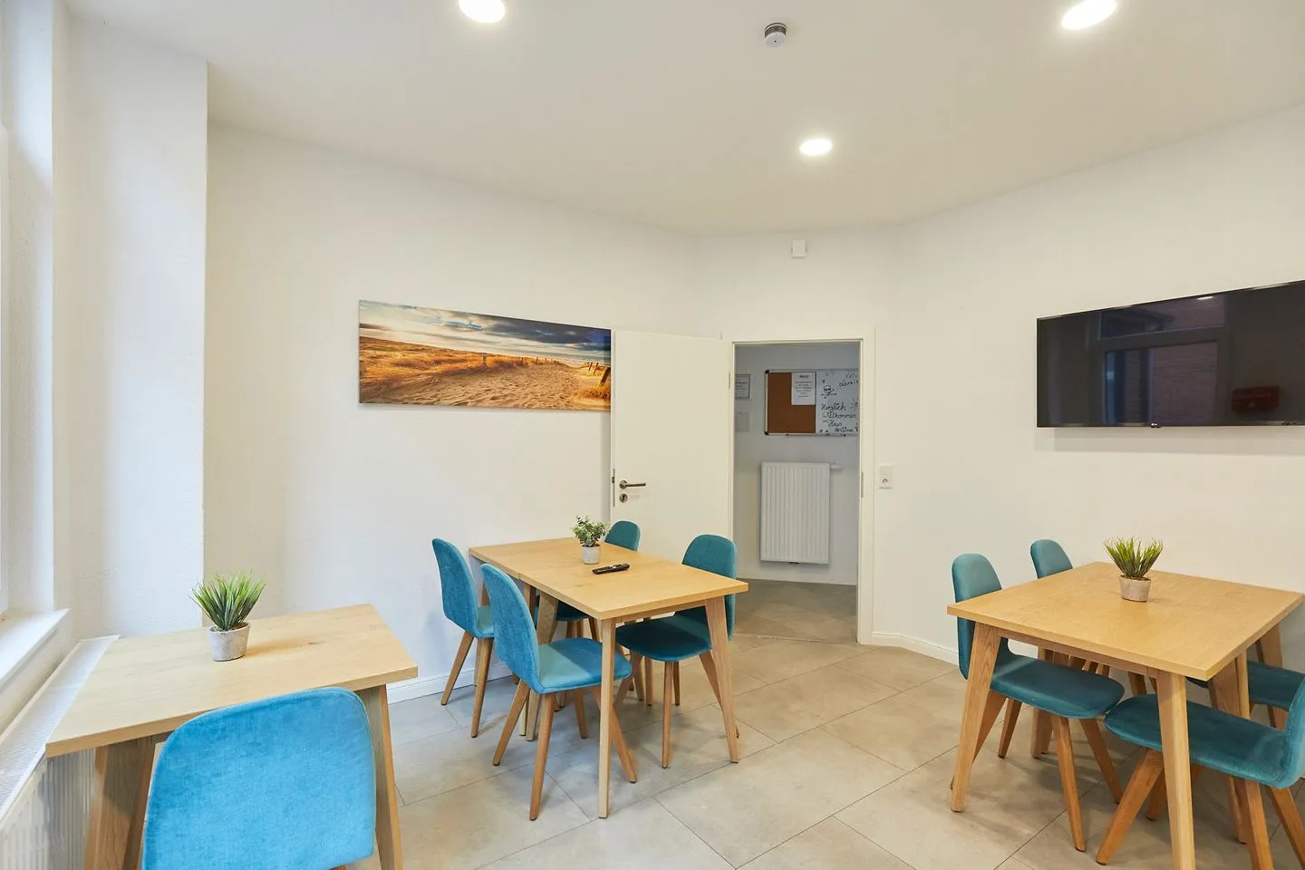 Im Erdgeschoss des Hauses steht den Gästen eine umfangreich ausgestattete Gemeinschaftsküche sowie eine Außenterrasse zur Verfügung. Hier können sich die Gäste Ihre Mahlzeiten zubereiten - dafür steht jedem Appartement ein eigener abschließbarer Kühlschrank zur exklusiven Nutzung zur Verfügung.