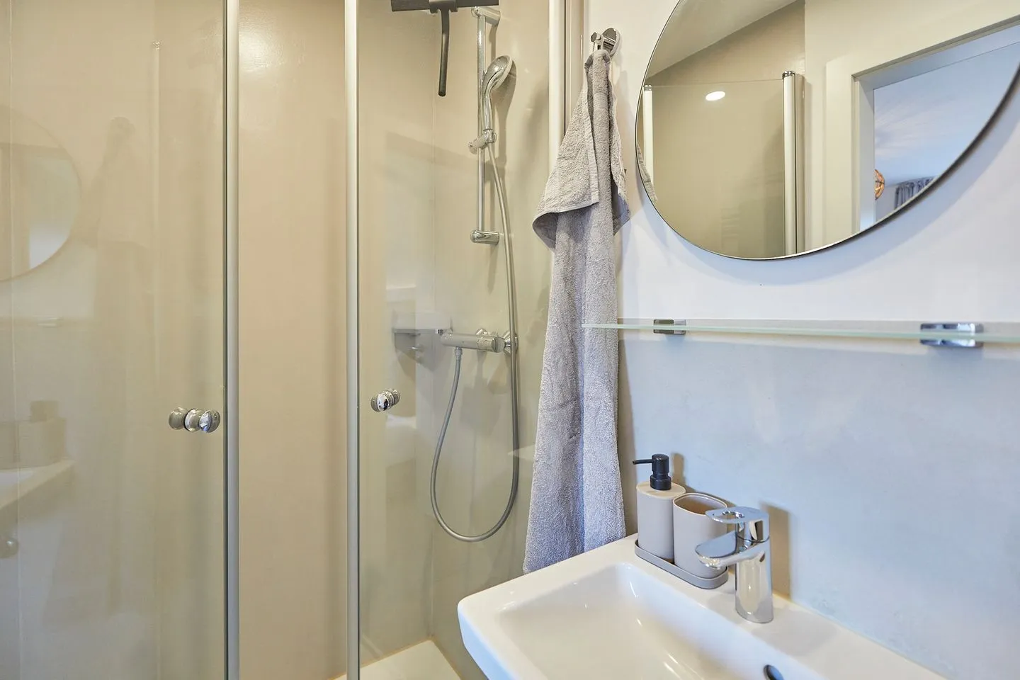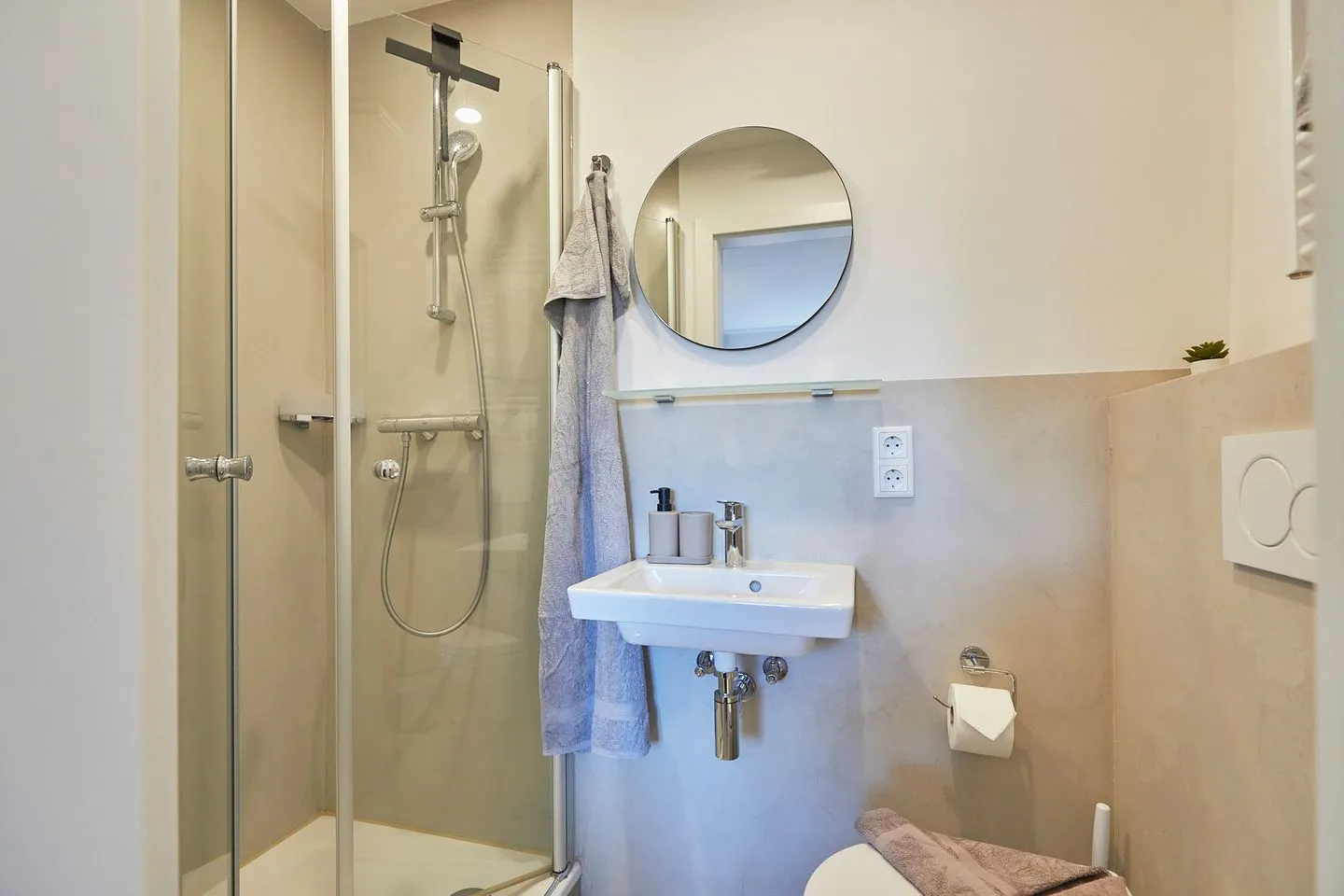 Modernes Doppelzimmer mit gemütlichem Boxspringbett und Duschbad. Eine Gemeinschaftsküche mit eigenem abschließbaren Kühlschrank für jedes Appartement sowie eine Gemeinschaftsterrasse runden den Komfort ab.