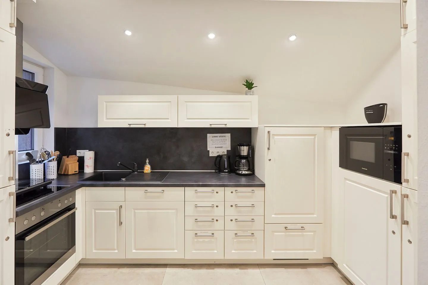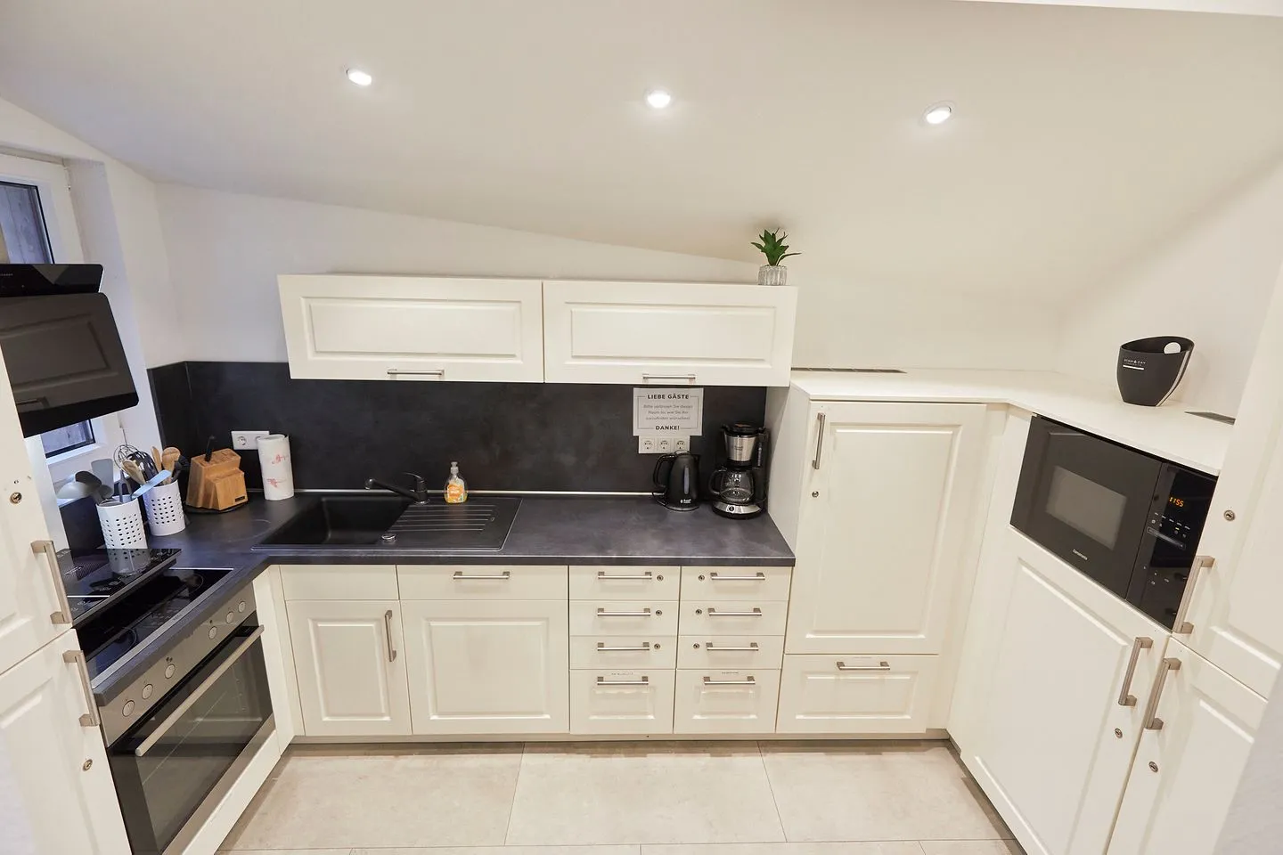 Im Erdgeschoss des Hauses steht den Gästen eine umfangreich ausgestattete Gemeinschaftsküche sowie eine Außenterrasse zur Verfügung. Hier können sich die Gäste Ihre Mahlzeiten zubereiten - dafür steht jedem Appartement ein eigener abschließbarer Kühlschrank zur exklusiven Nutzung zur Verfügung.