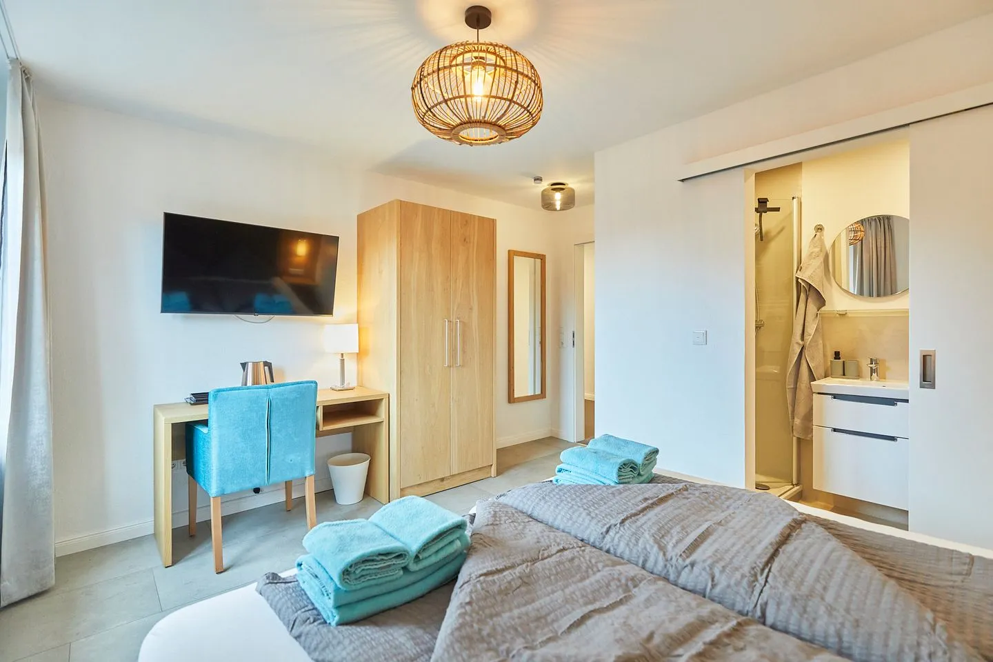 Das moderne Appartmenthaus Antina bietet sechs gemütliche Zimmer für jeweils zwei Personen. Jedes Appartment verfügt über ein Duschbad mit bodentiefer Duschtasse und eine kleine Teestation mit Wasserkocher. Die hochwertigen Boxspringbetten versprechen erholsame Nachtruhe. Bettwäsche, Handtücher und Endreinigung sind im Mietpreis inklusive.