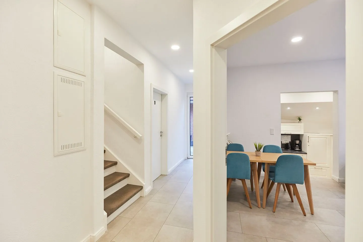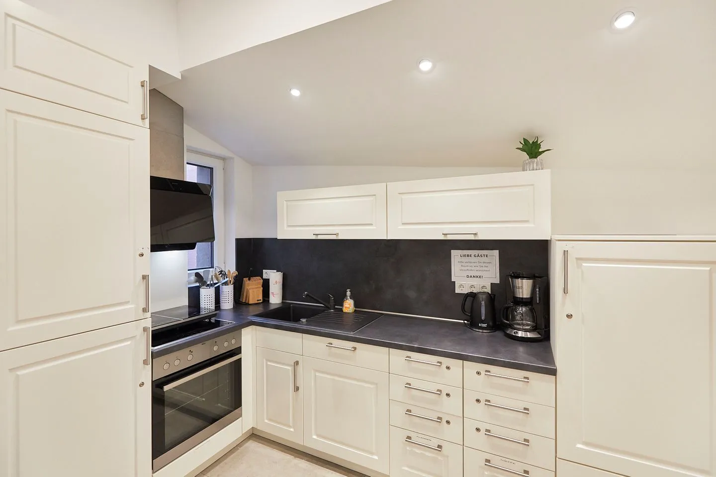Im Erdgeschoss des Hauses steht den Gästen eine umfangreich ausgestattete Gemeinschaftsküche sowie eine Außenterrasse zur Verfügung. Hier können sich die Gäste Ihre Mahlzeiten zubereiten - dafür steht jedem Appartement ein eigener abschließbarer Kühlschrank zur exklusiven Nutzung zur Verfügung.