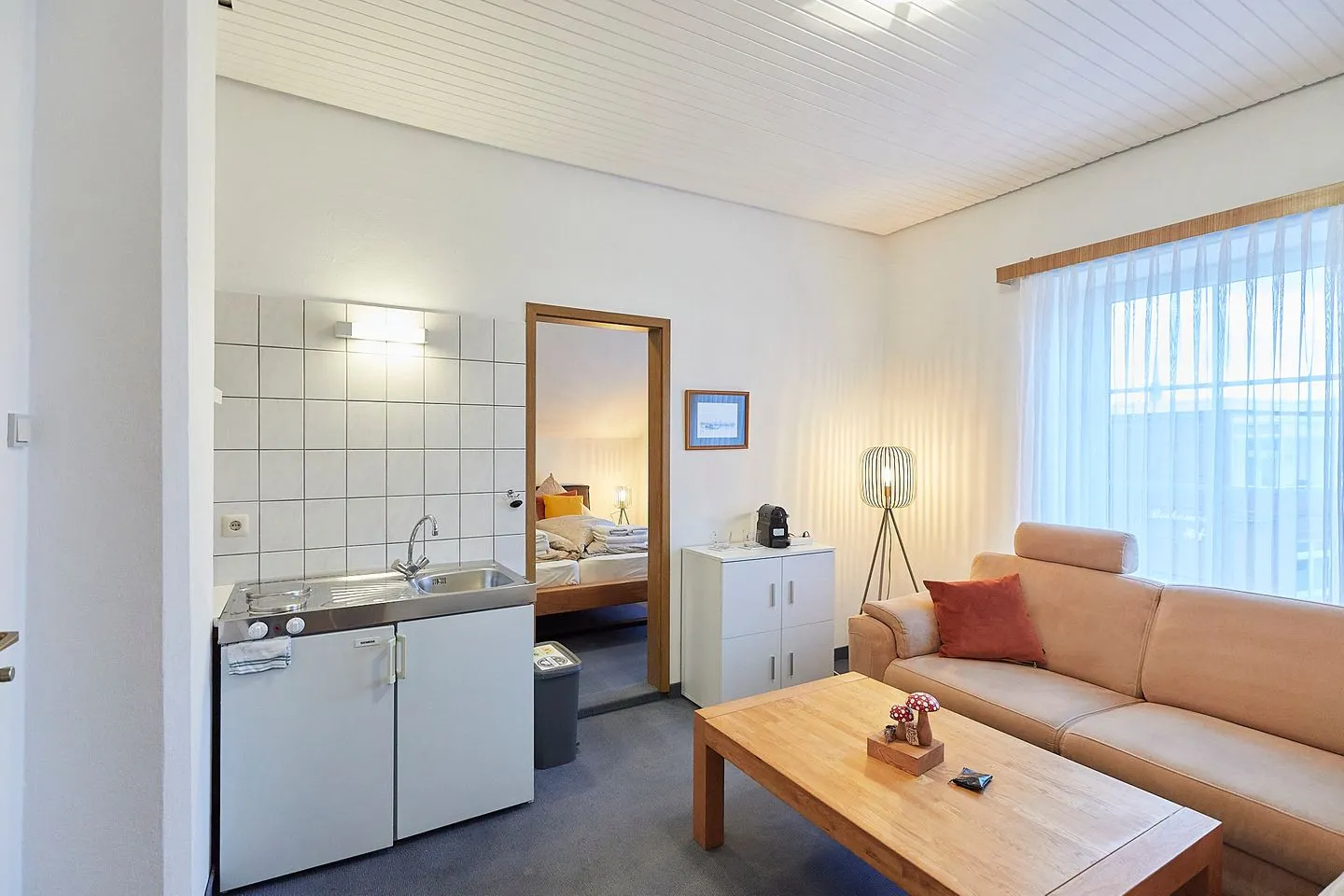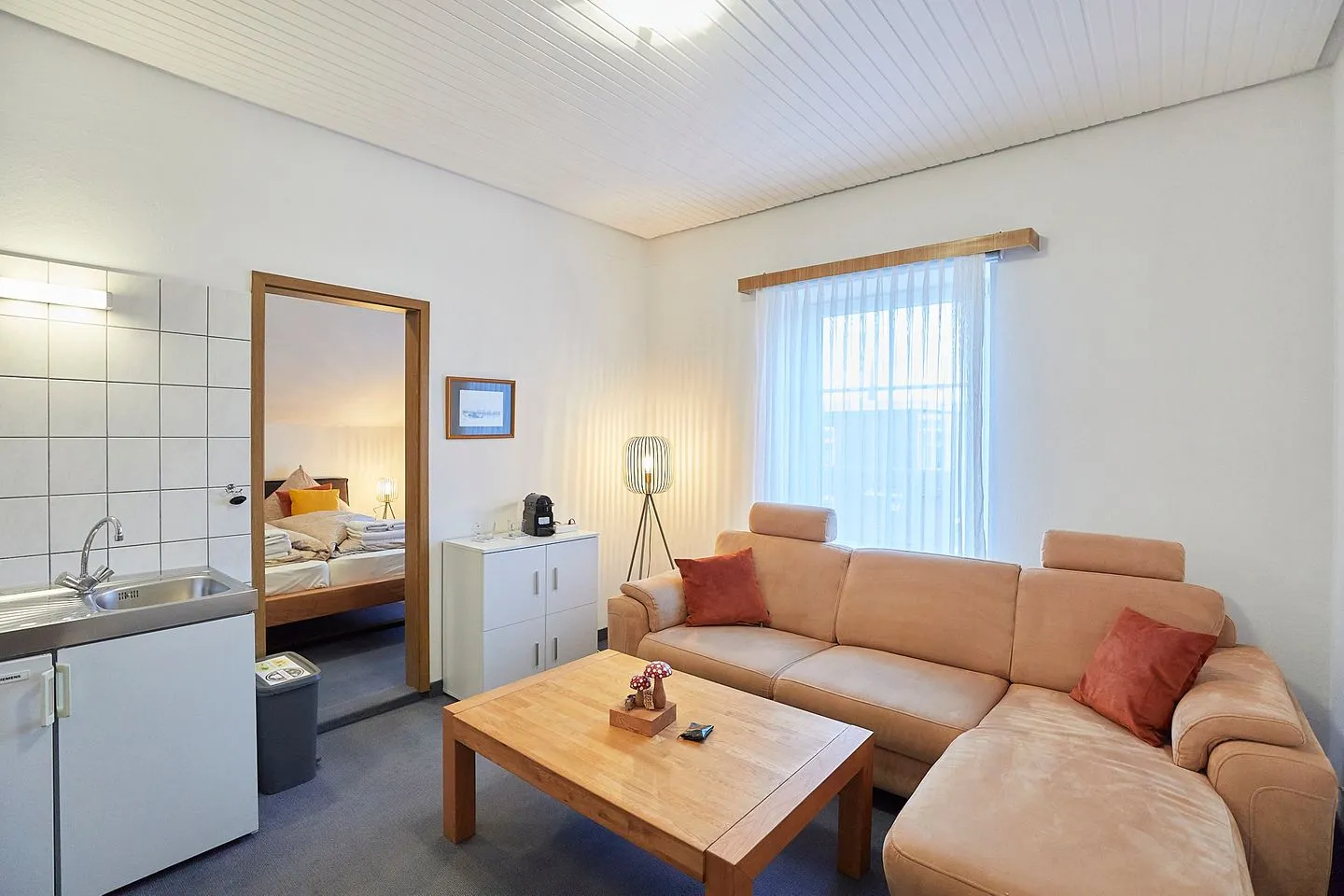 Wohnbereich mit Sofa und Teeküche