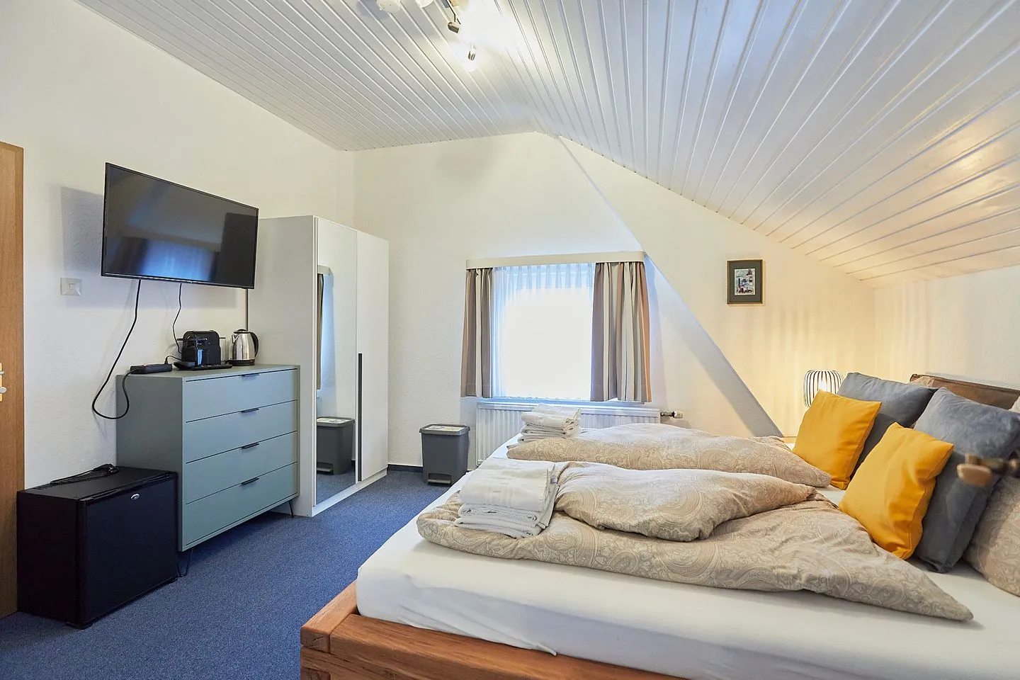Das App. 9 befindet sich im Dachgeschoss des Hauses. Es bietet ein Doppelbett und eine Sitzecke mit TV. Das Tageslichtbad mit Dusche und WC sowie eine kleine Teestation mit Kühlschrank runden den Wohnkomfort ab.